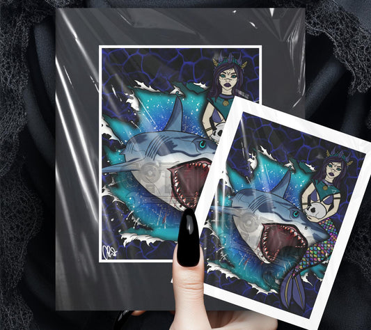 Shark Siren Gothic Art Print – Dark Mermaid & Killer Shark Ocean Artwork, 8x6 or 11x14 Matted