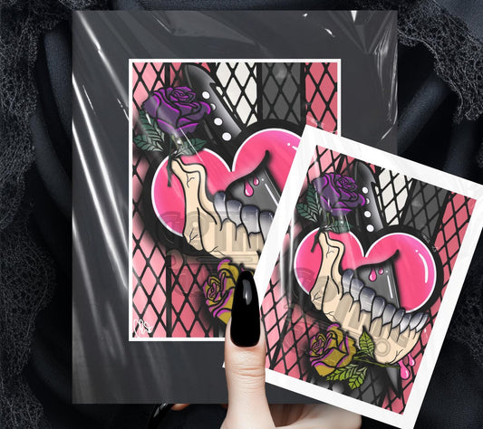 Rebel Heart Gothic Art Print – Punk Skeleton Hand with Rose, 8x6 or 11x14 Matted