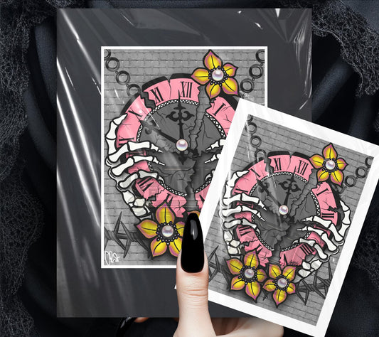 Gothic Broken Clock Art Print – Skeleton Hands & Dark Floral Wall Decor, 8×6 or 11×14 Matted