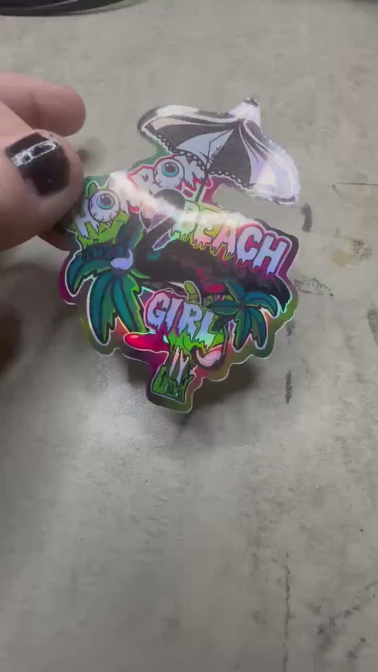 Horror Beach Girl Waterproof Sticker – Gothic Flamingo Palm Tree Decal in Glossy or Holographic Finish