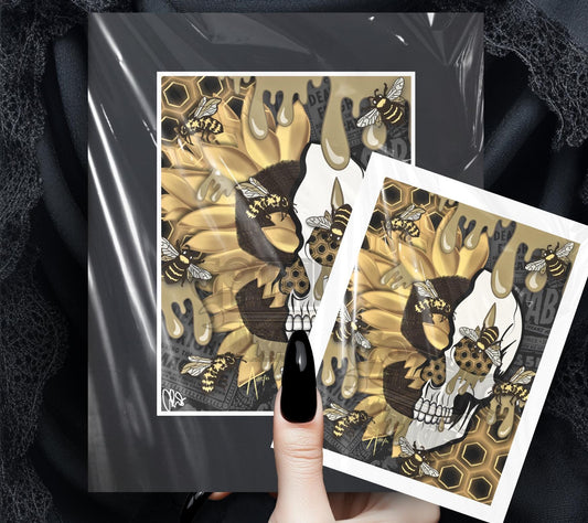 Sunflower Hive Skull Art Print – Gothic Bee & Honeycomb Wall Decor for Alternative Home or Gallery