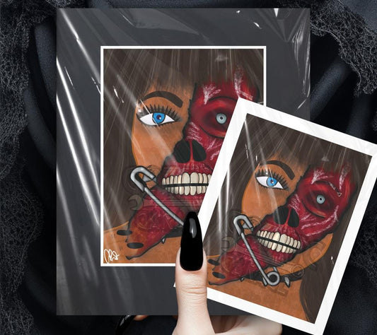 Gothic Horror Art Print – Split Face Girl with Safety Pin Mouth, Creepy Anatomical Wall Decor, Dark Feminine Macabre Artwork